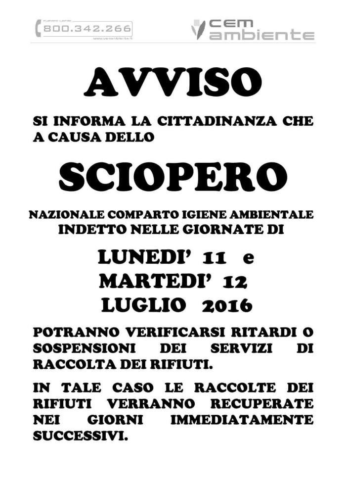 Avviso sciopero nazionale comparto igiene ambientale privata lunedì 11 luglio e martedì 12 luglio 2016.